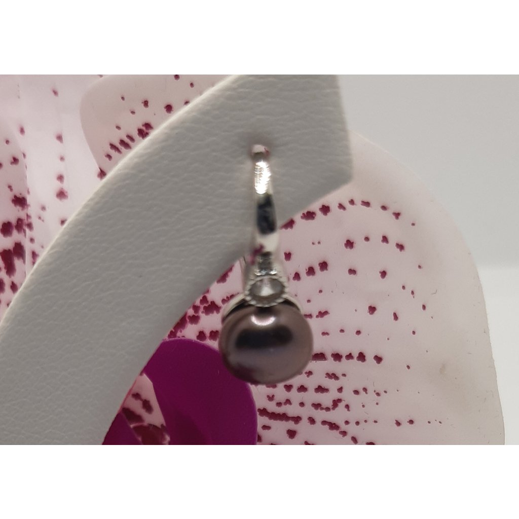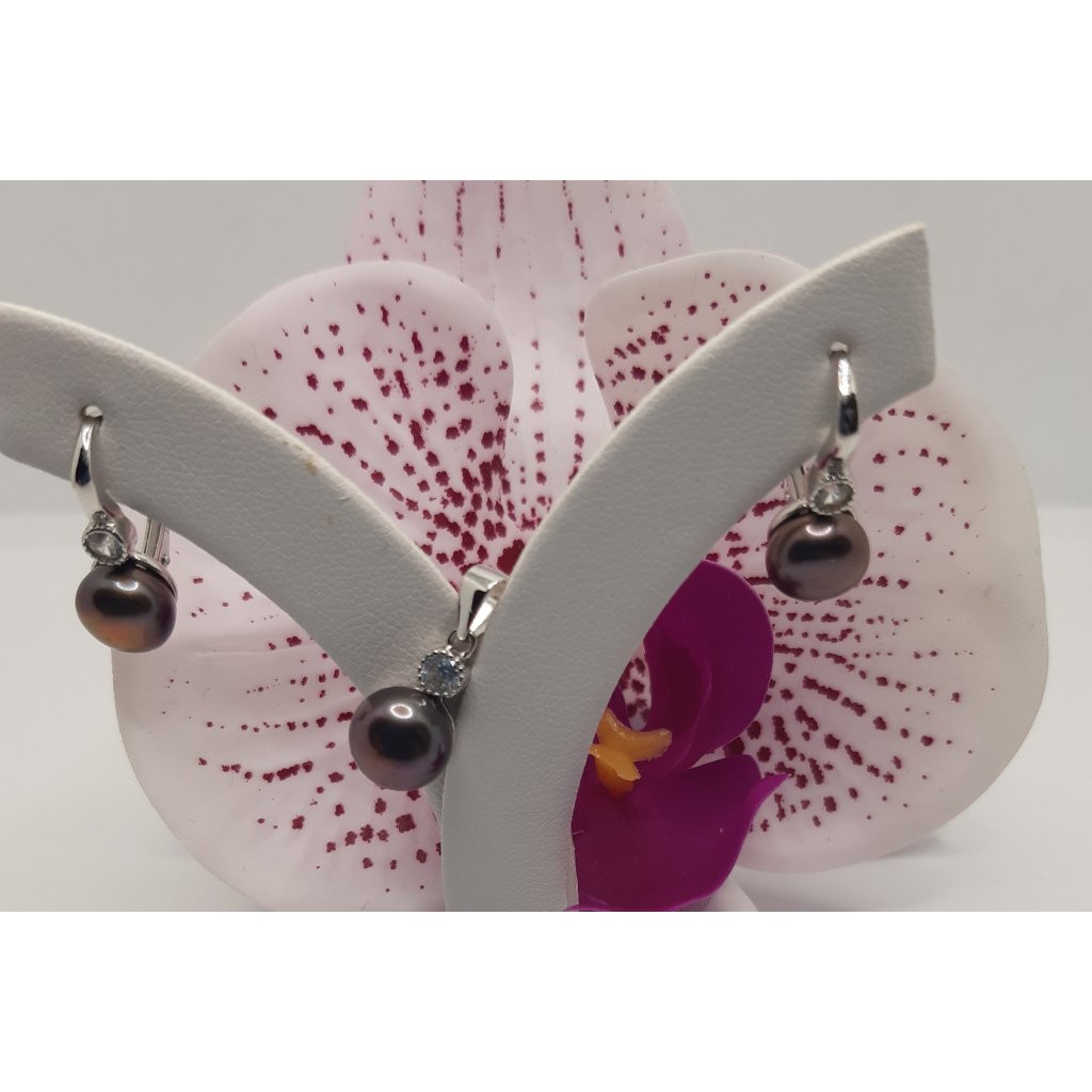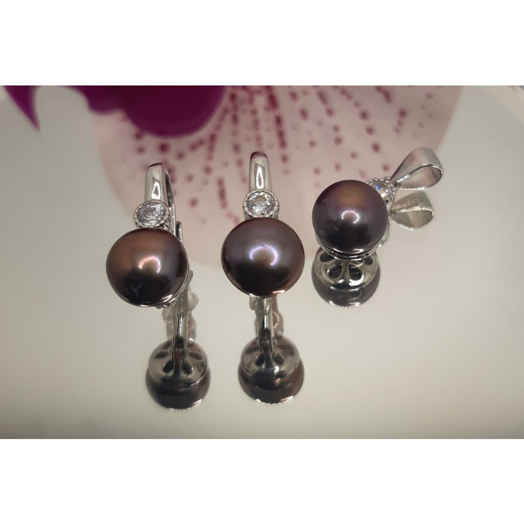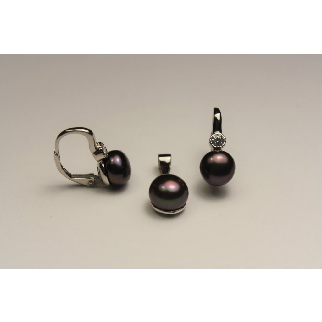 Jedinečná strieborná súprava s čiernou syntetickou perlou+ biely zirkon osadený v ozdobnej obrube. Rhodiovaná. Perla sploštená priemer 6mm. Zapínanie na patent . Výška náušníc 16mm výška prívesku 17mm. Váha 4,11g. Rýdzosť 925/1000.