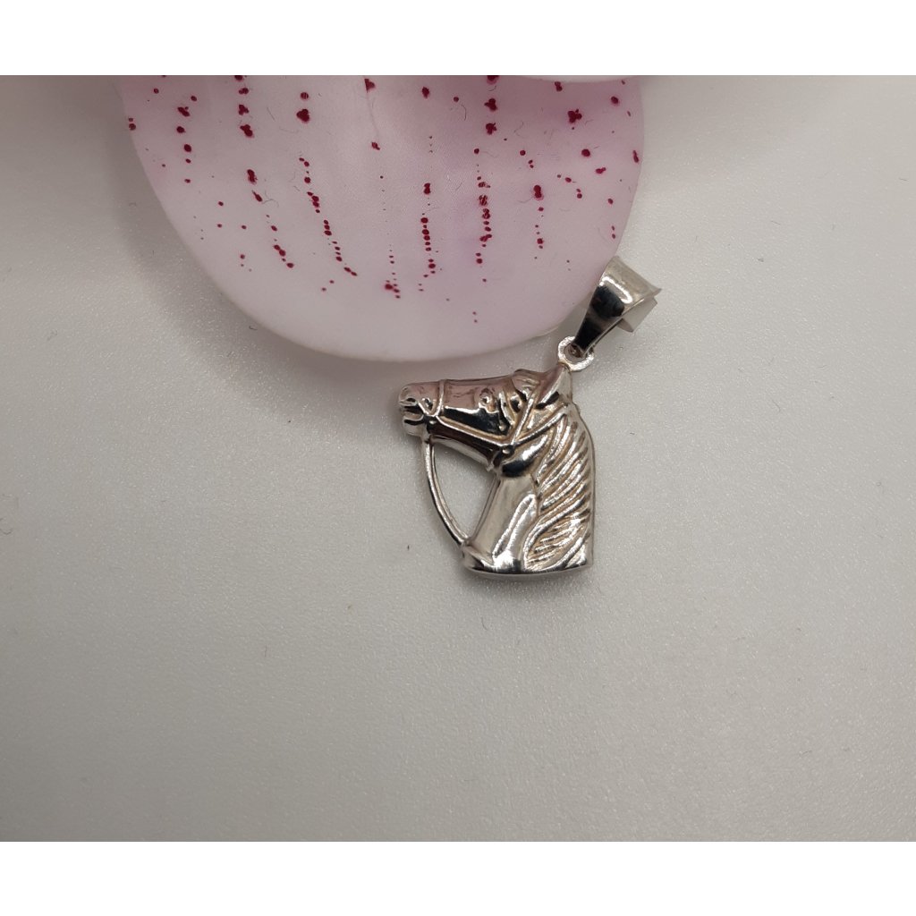Milý prívesok zo striebra obojstranná konská hlava. Striebro je rhodiované. Prívesok má výšku 15 mm šírku 18 mm, s uškom 22 mm Vnútorný priemer uška na prevlečenie retiazky je 3,4 mm. Rýdzosť 925/1000. Váha 0,80g