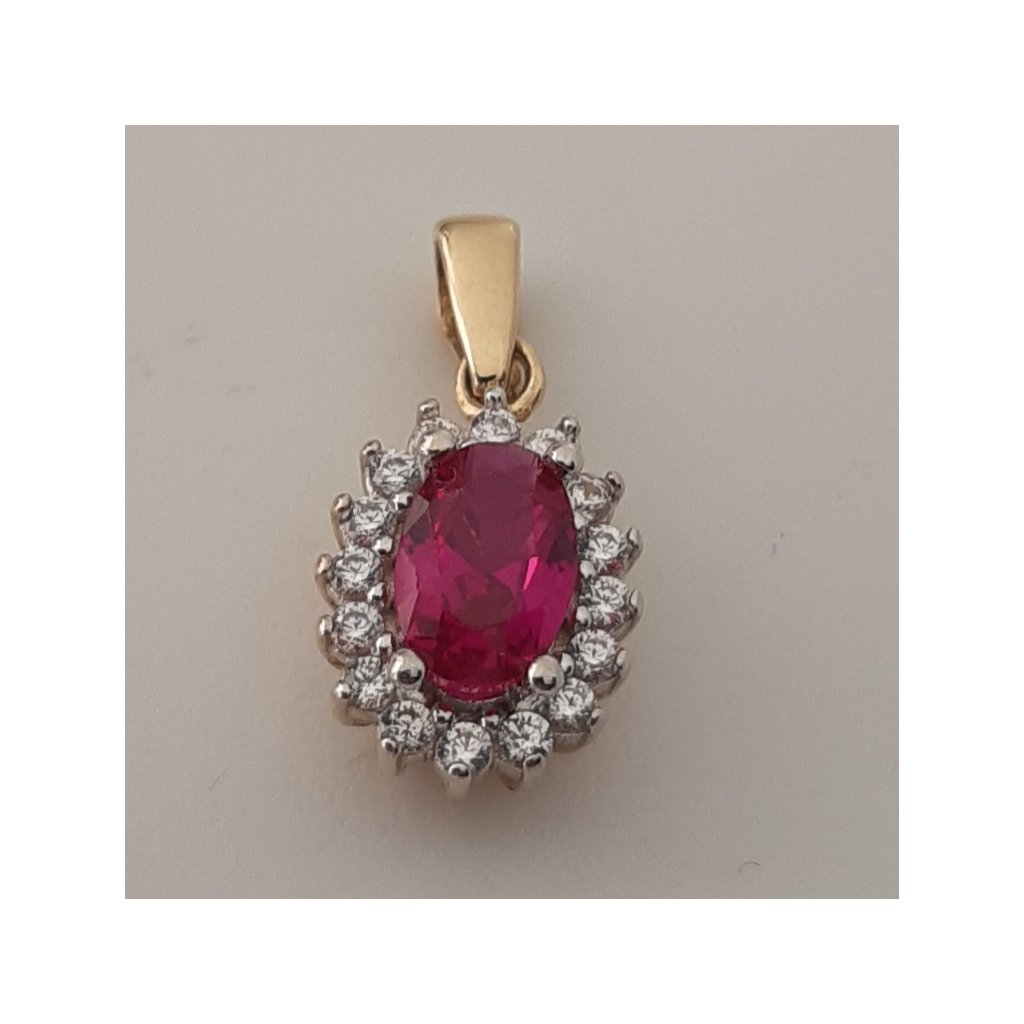 Zlatý prívesok dámsky s rubínom ovál 6x4, po obvode zdobený drobnými zirkonami. Vhodný do súpravy s náušnicami. Výška s uškom 15mm ( bez uška 10mm) šírka 7mm. Vyrobený zo žltého zlata rýdzosť 585/1000, váha 0,88g.